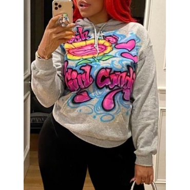Lovely Street Hooded Collar Letter Print Grey Hoodie