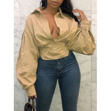 Lovely Stylish Turndown Collar Buttons Design Khaki Blouse