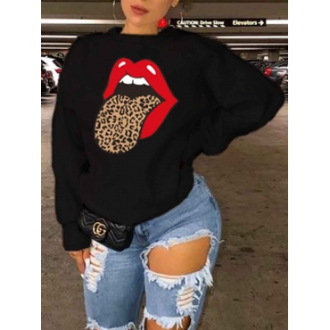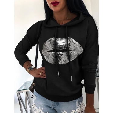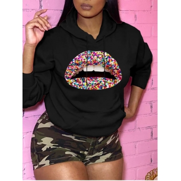 Lovely Leisure O Neck Lip Print Black Hoodie