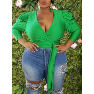 Lovely Trendy V Neck Lace-up Green Plus Size Blouse