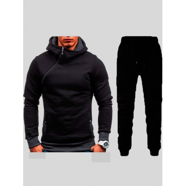 Lovely Leisure Hooded Collar Zipper Design Black Men Two-piece Pants Set