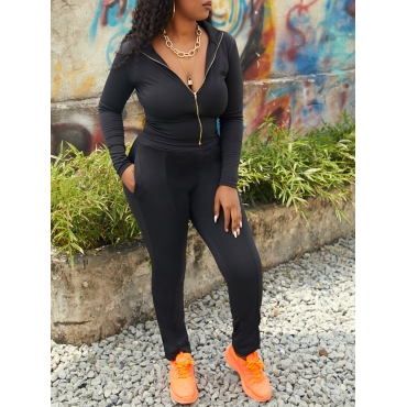 Lovely Sportswear Zipper Design Black Plus Size Two-piece Pants Set