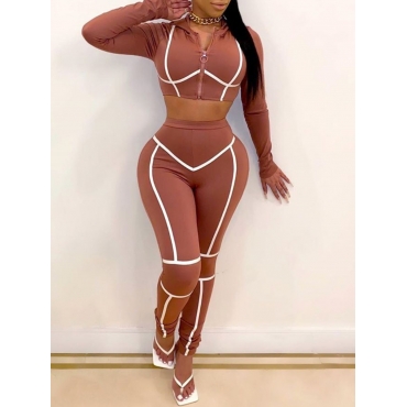 Lovely Sportswear Hooded Collar Patchwork Cameo Brown Two Piece Pants Set