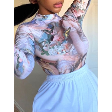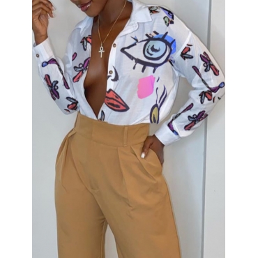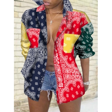 Lovely Stylish Turndown Collar Print Patchwork Black Blouse