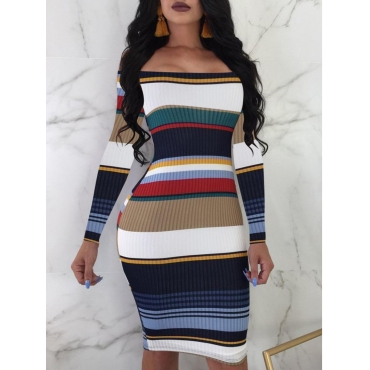 Lovely Stylish Dew Shoulder Striped Blue Knee Length Dress