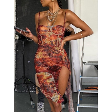 Lovely Sexy Spaghetti Strap Print Asymmetrical Red Knee Length Dress