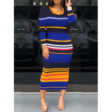 Lovely Casual U Neck Striped Blue Mid Calf Dress