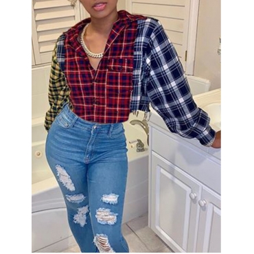Lovely Stylish Turndown Collar Grid Print Patchwork Deep Blue Blouse