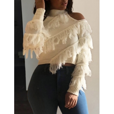 Lovely Stylish Turtleneck Hollow-out Tassel Design Beige Sweater