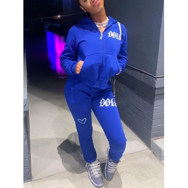 Lovely Casual Hooded Collar Embroidered Zipper Design Royalblue Two Piece Pants Set