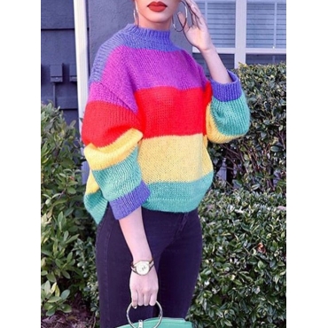 Lovely Trendy O Neck Rainbow Striped Multicolor Sweater