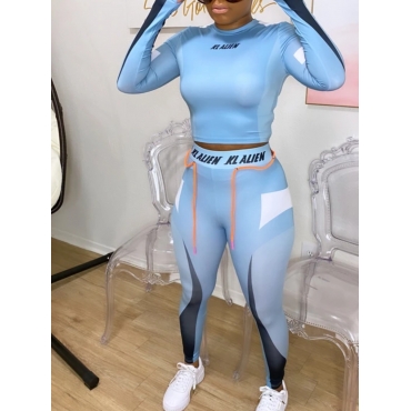 Lovely Sportswear O Neck Letter Patchwork Blue Two Piece Pants Set