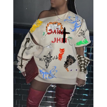 Lovely Casual Graffiti Print Zipper Design Apricot Mini Plus Size Dress