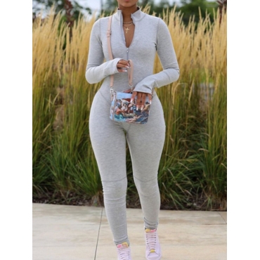 Lovely Sportswear Zipper Design Skinny Light Grey Plus Size One-piece Jumpsuit