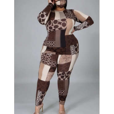 Lovely Stylish O Neck Print Brown Plus Size Two-piece Pants Set