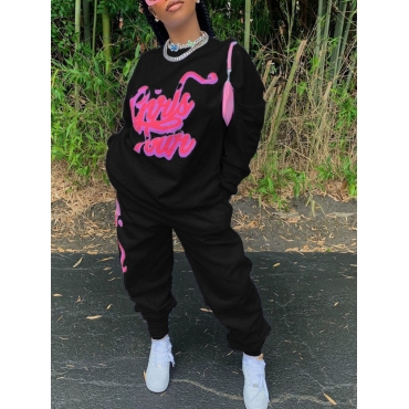 Lovely Sportswear O Neck Letter Print Black Two Piece Pants Set
