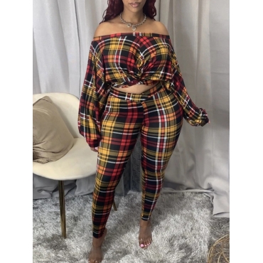 Lovely Trendy Dew Shoulder Grid Print Black And Red Plus Size Two-piece Pants Set