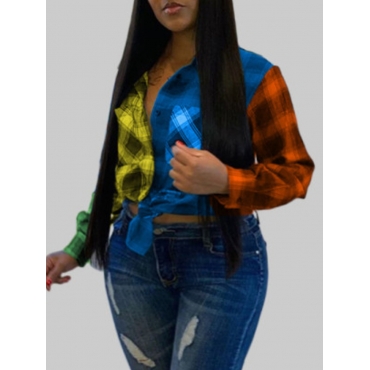 Lovely Street Turndown Collar Grid Print Blue Plus Size Blouse