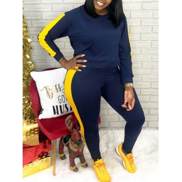 Lovely Sportswear O Neck Patchwork Blue Plus Size Two-piece Pants Set
