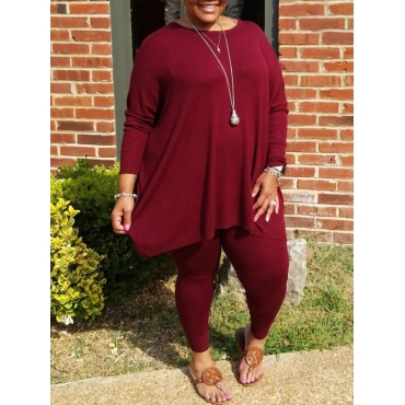 Lovely Casual O Neck Asymmetrical Wine Red Plus Size Two-piece Pants Set