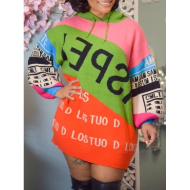 Lovely Street Hooded Collar Letter Print Patchwork Multicolor Mini Dress