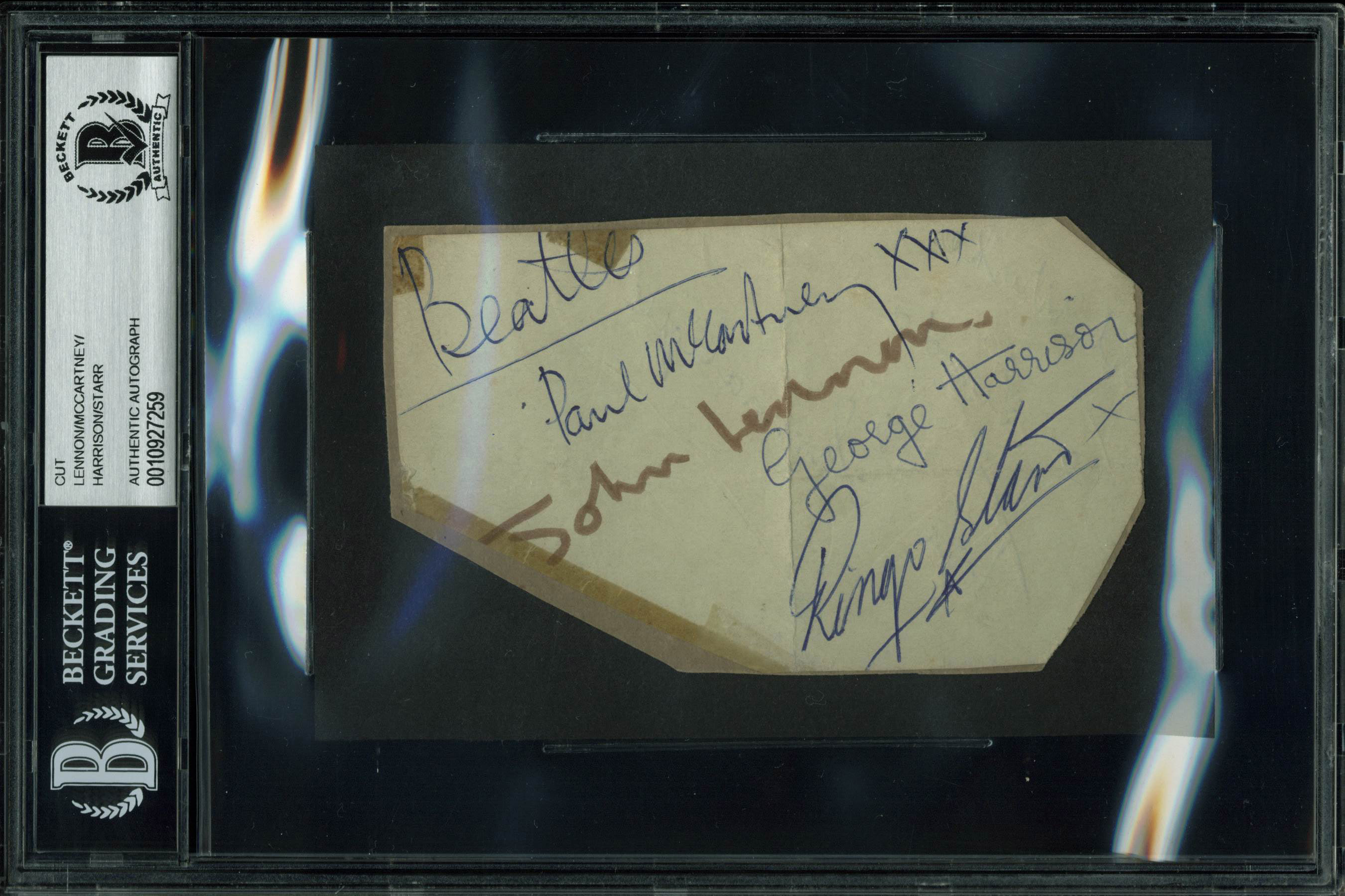 Beatles (4) Lennon McCartney Harrison & Starr Signed 3x5 Cut Signature BAS Slab