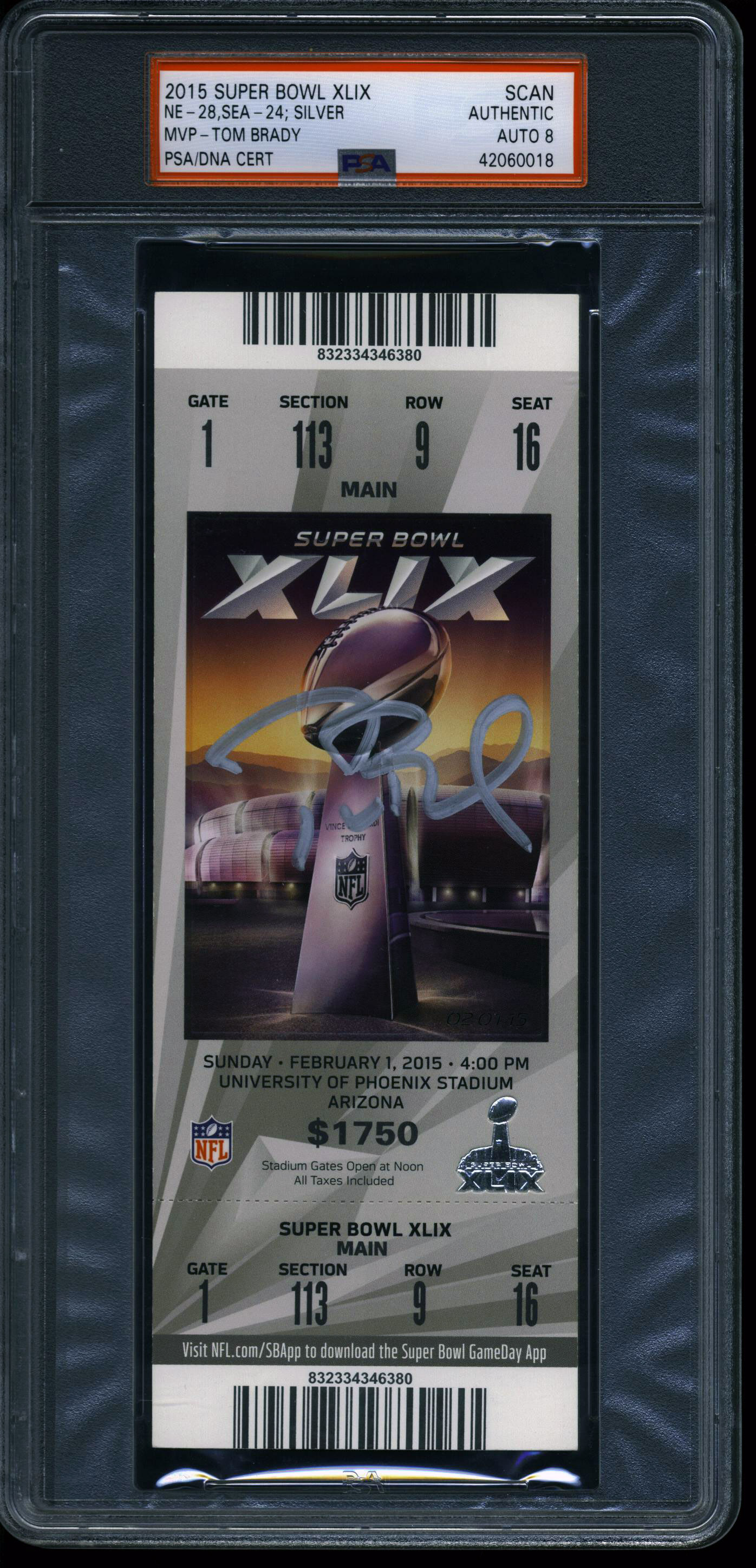 Patriots Tom Brady Signed Super Bowl XLIX Ticket Stub Auto Graded 8! PSA Slabbed