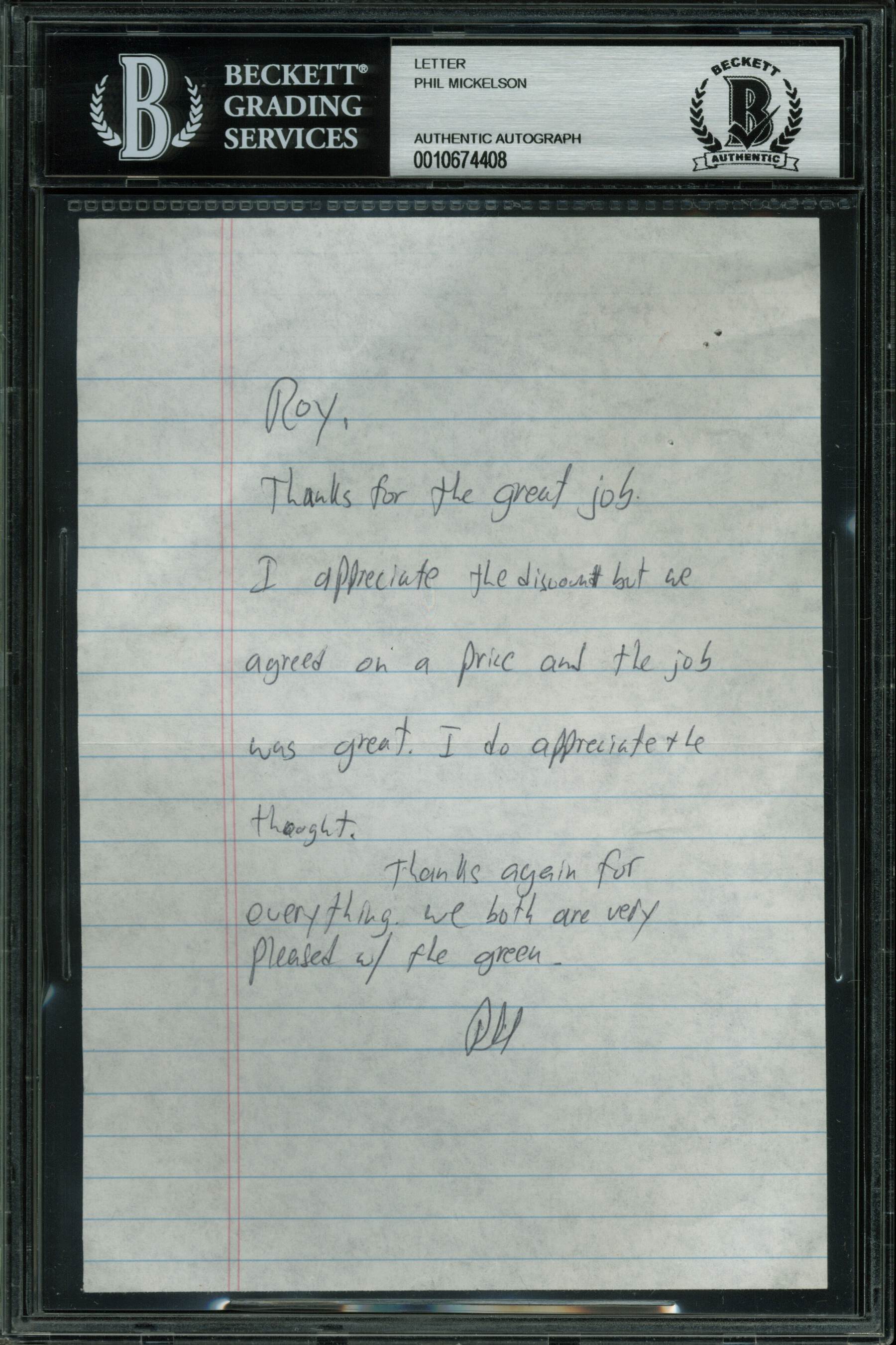 Phil Mickelson Authentic Signed 5x7.25 Handwritten Letter BAS Slabbed