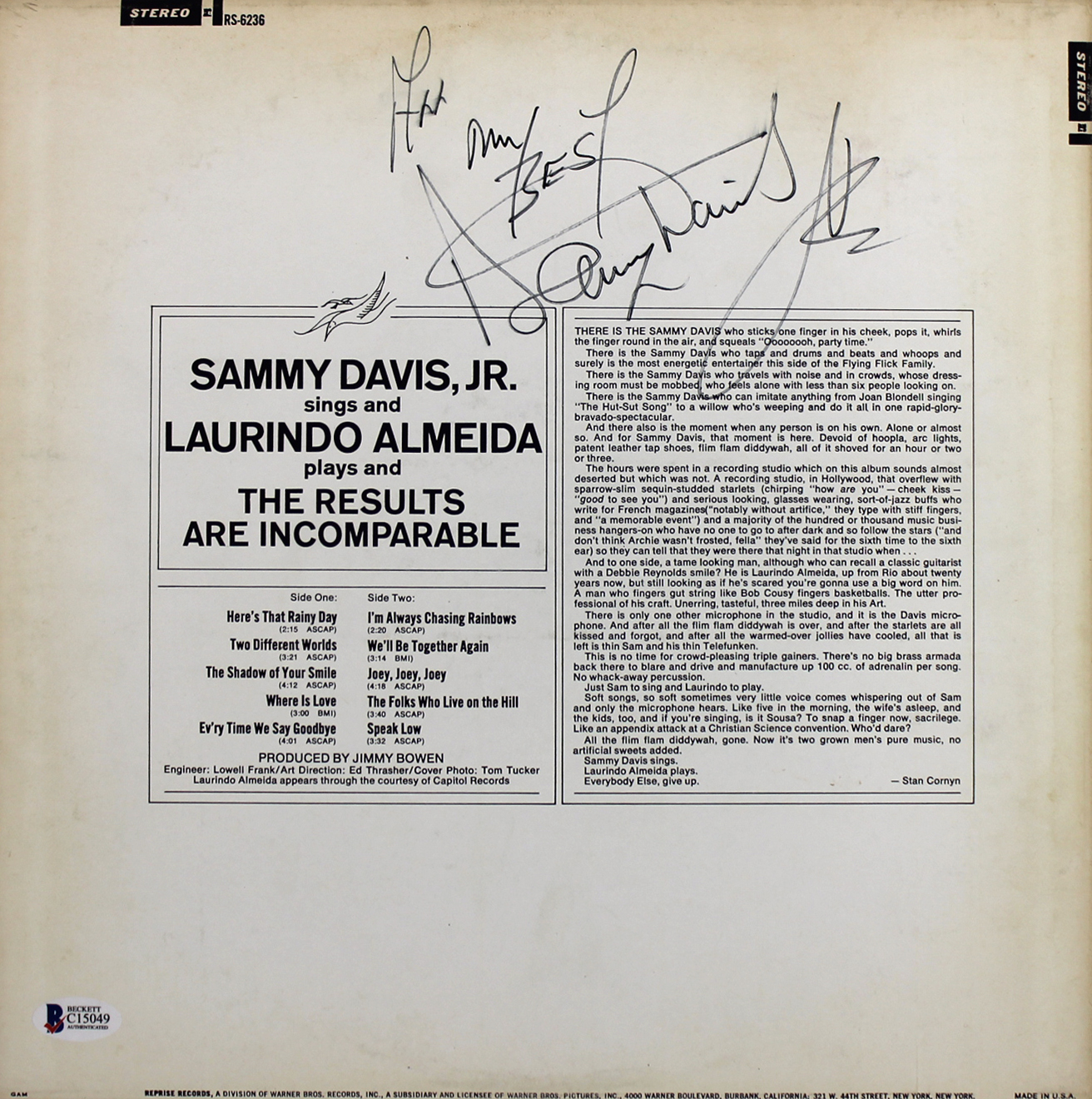 Sammy Davis Jr. "All My Best" Signed Album Cover W/ Vinyl BAS #C15049