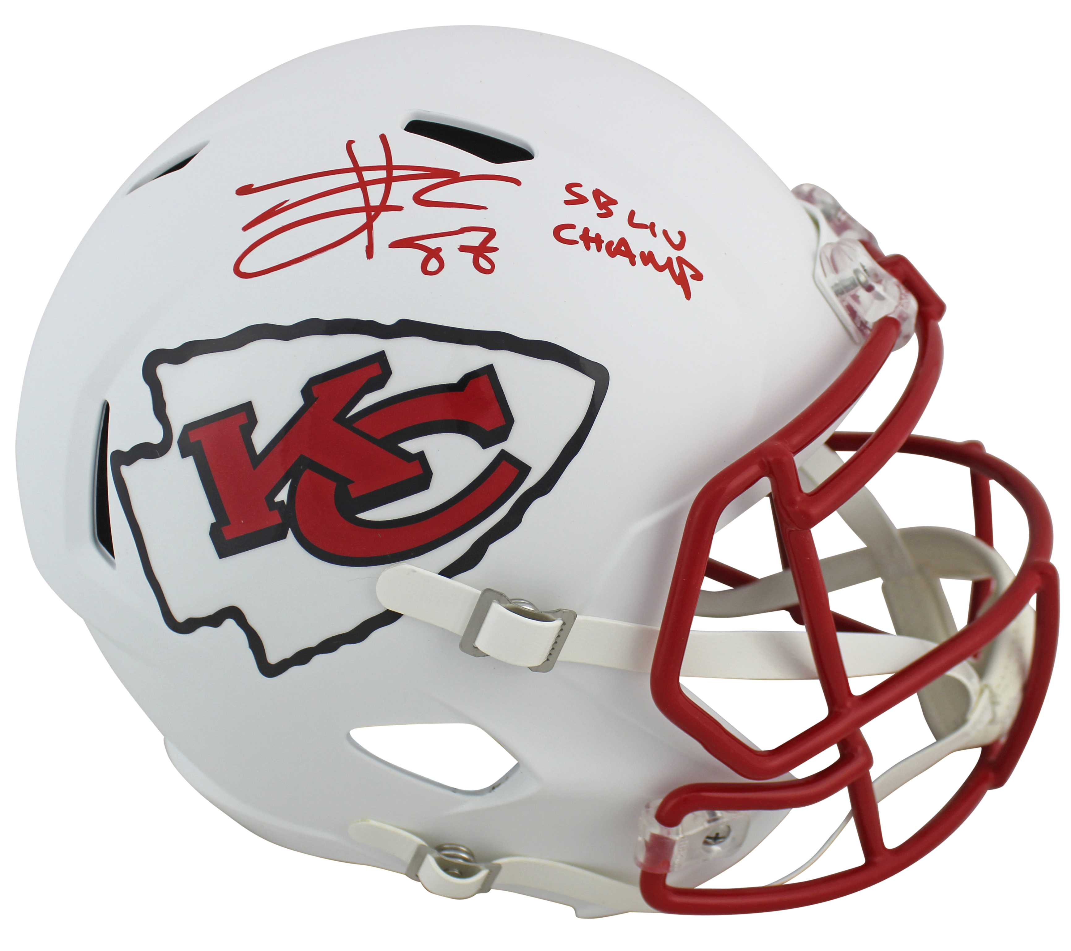 Chiefs Travis Kelce "SB LIV Champ" Signed Flat White F/S Speed Rep Helmet BAS