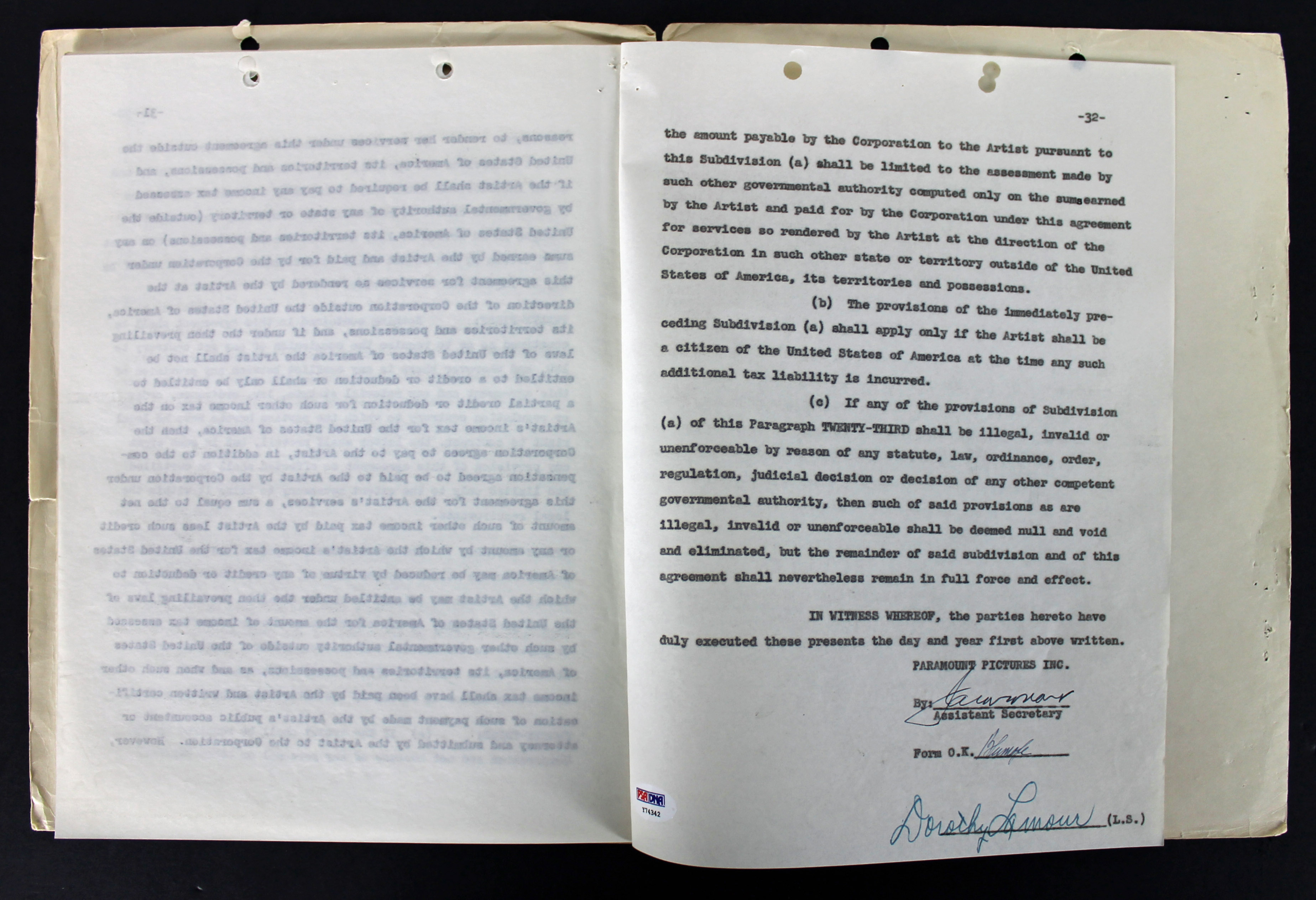 Dorothy Lamour Signed 1947 Paramount Pictures 'Road To Rio' Contract PSA #Y74342