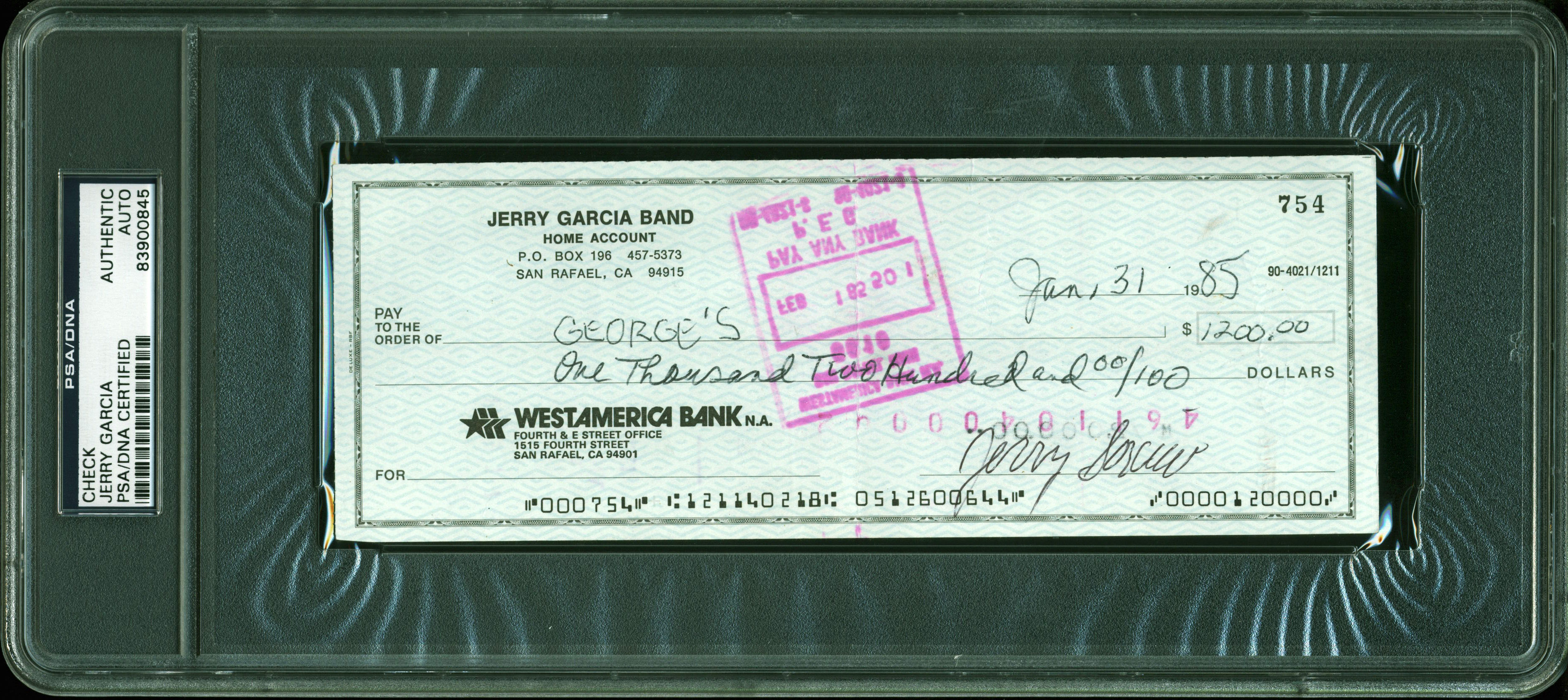 Jerry Garcia Grateful Dead Signed 3x8.25 Check Dated June 31, 1985 PSA Slabbed