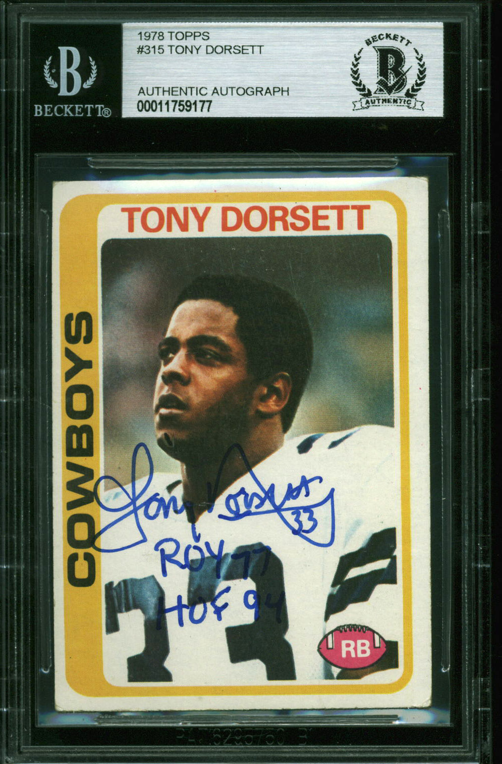 Cowboys Tony Dorsett "ROY 77, HOF 94" Signed 1978 Topps #315 RC Card BAS Slab 2