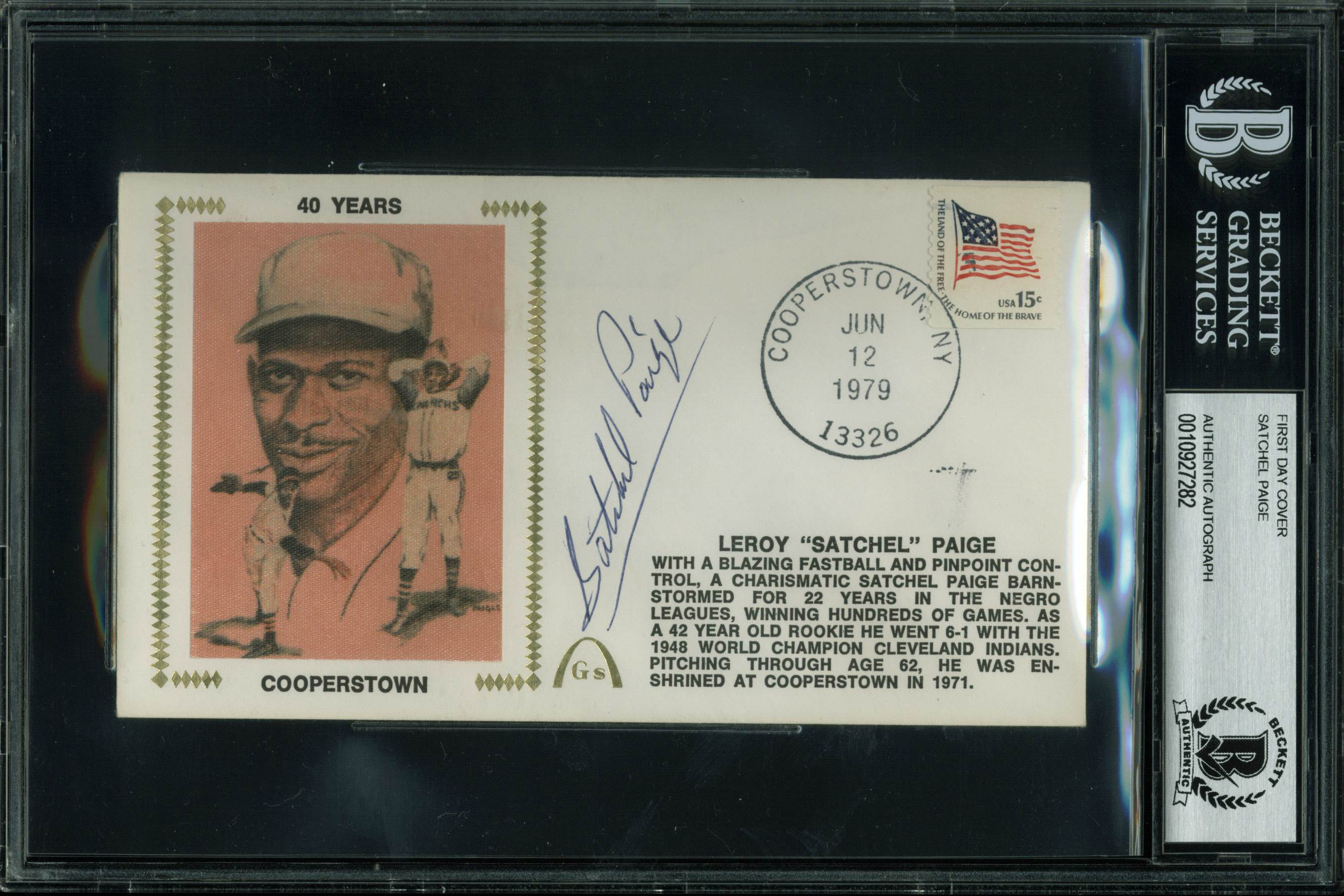 Satchel Paige Signed 3.75x6.5 First Day Cover Postmarked June 12, 1979 BAS Slab
