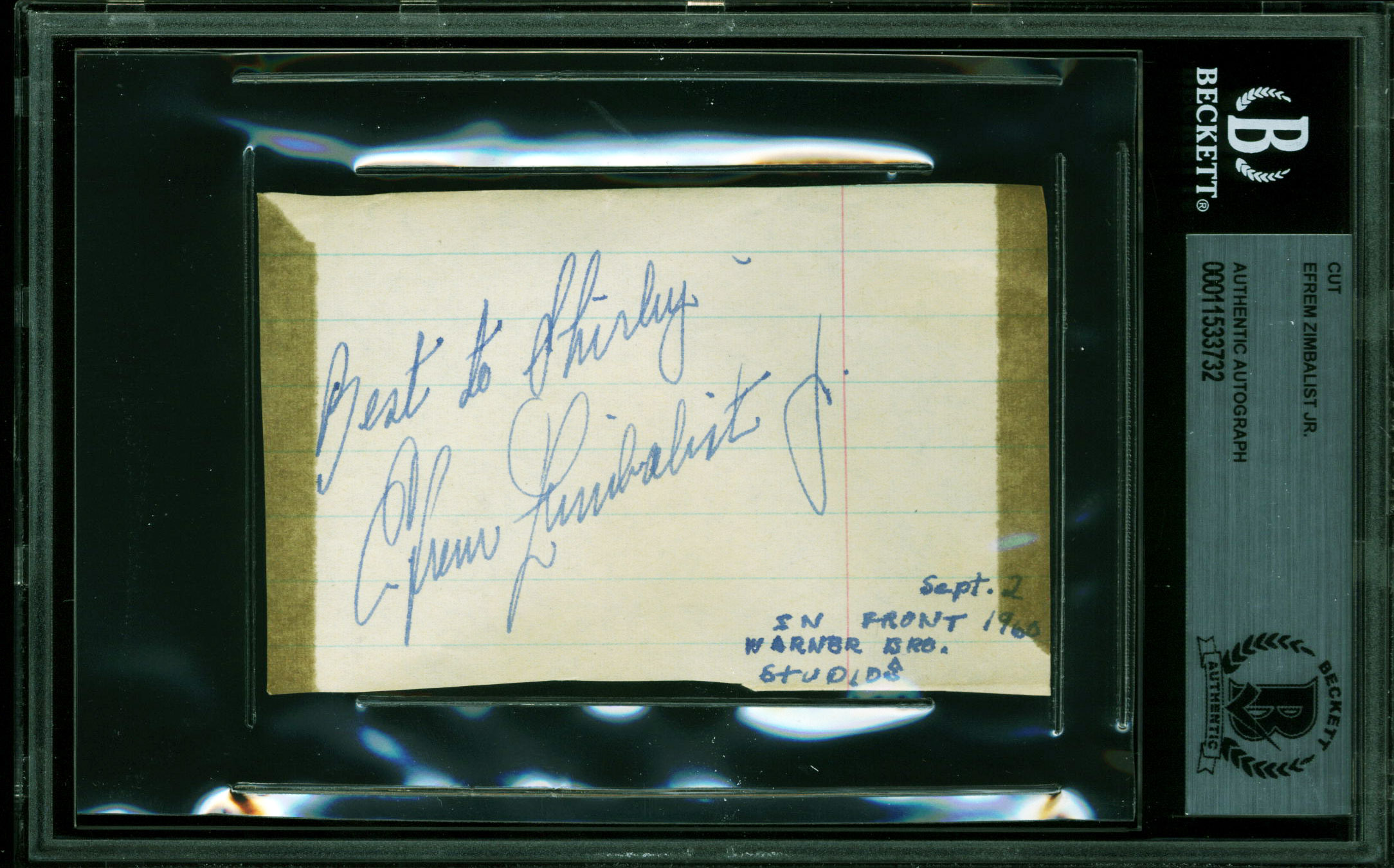 Efrem Zimbalist Jr. 77 Sunset Strip Signed 2.5x4 Cut Signature BAS Slabbed