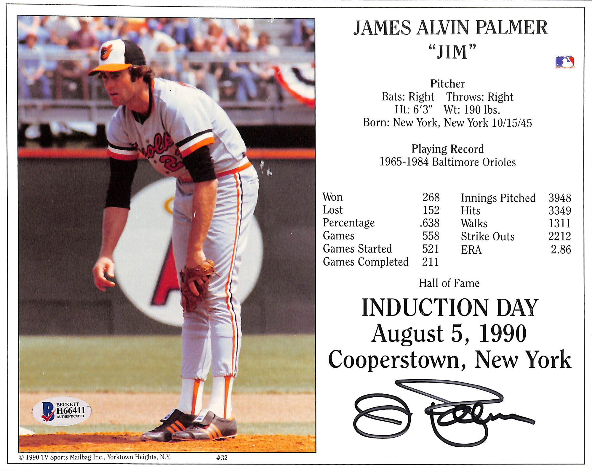 Orioles Jim Palmer Authentic Signed 8x10 Induction Day Stat Photo BAS #H66411