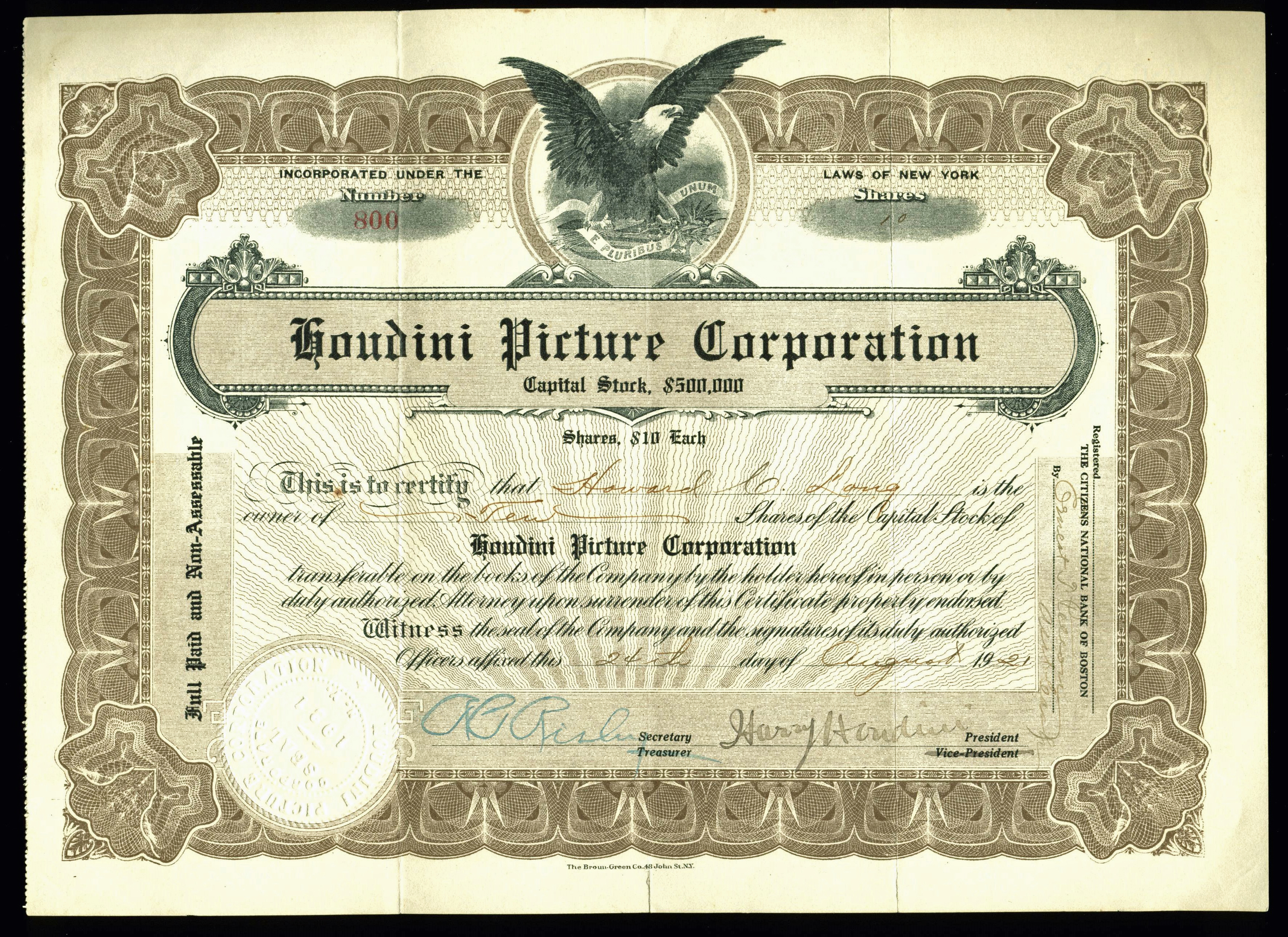 Harry Houdini Signed Houdini Picture Corporation Stock Certificate BAS #A87591