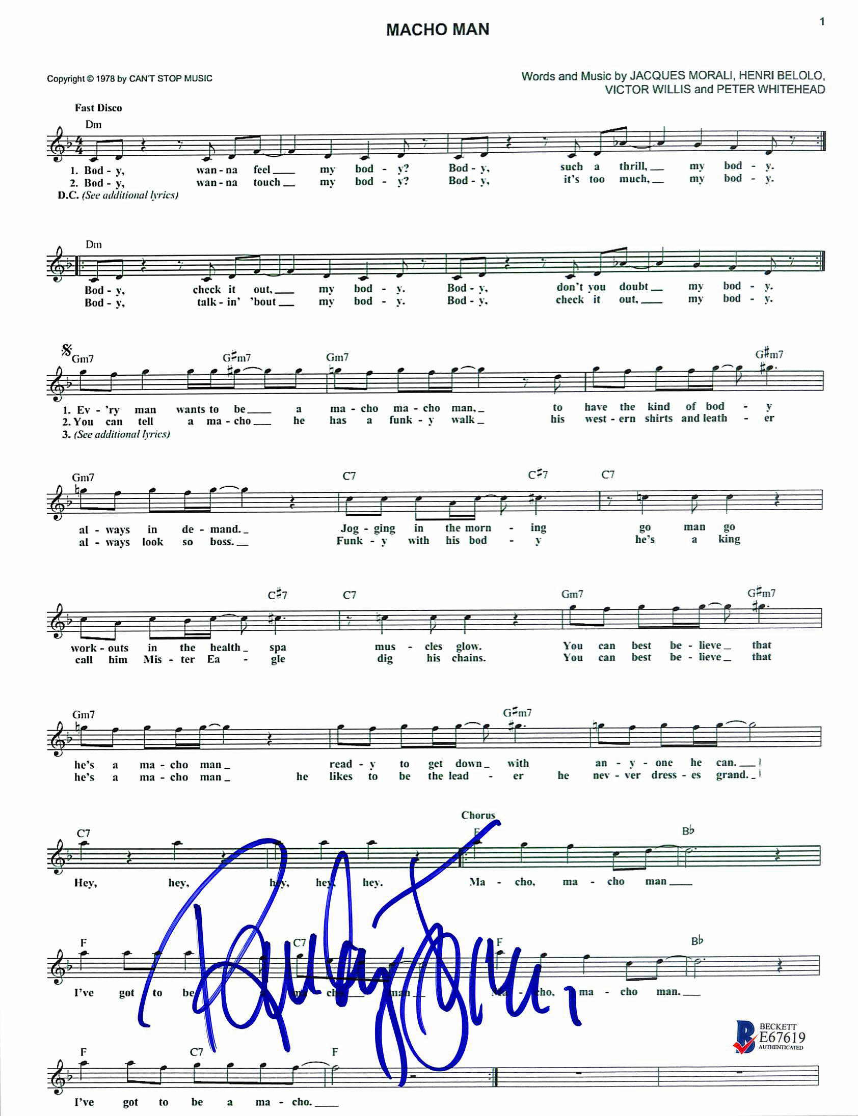Randy Jones Village People Authentic Signed Macho Man Music Sheet BAS #E67619