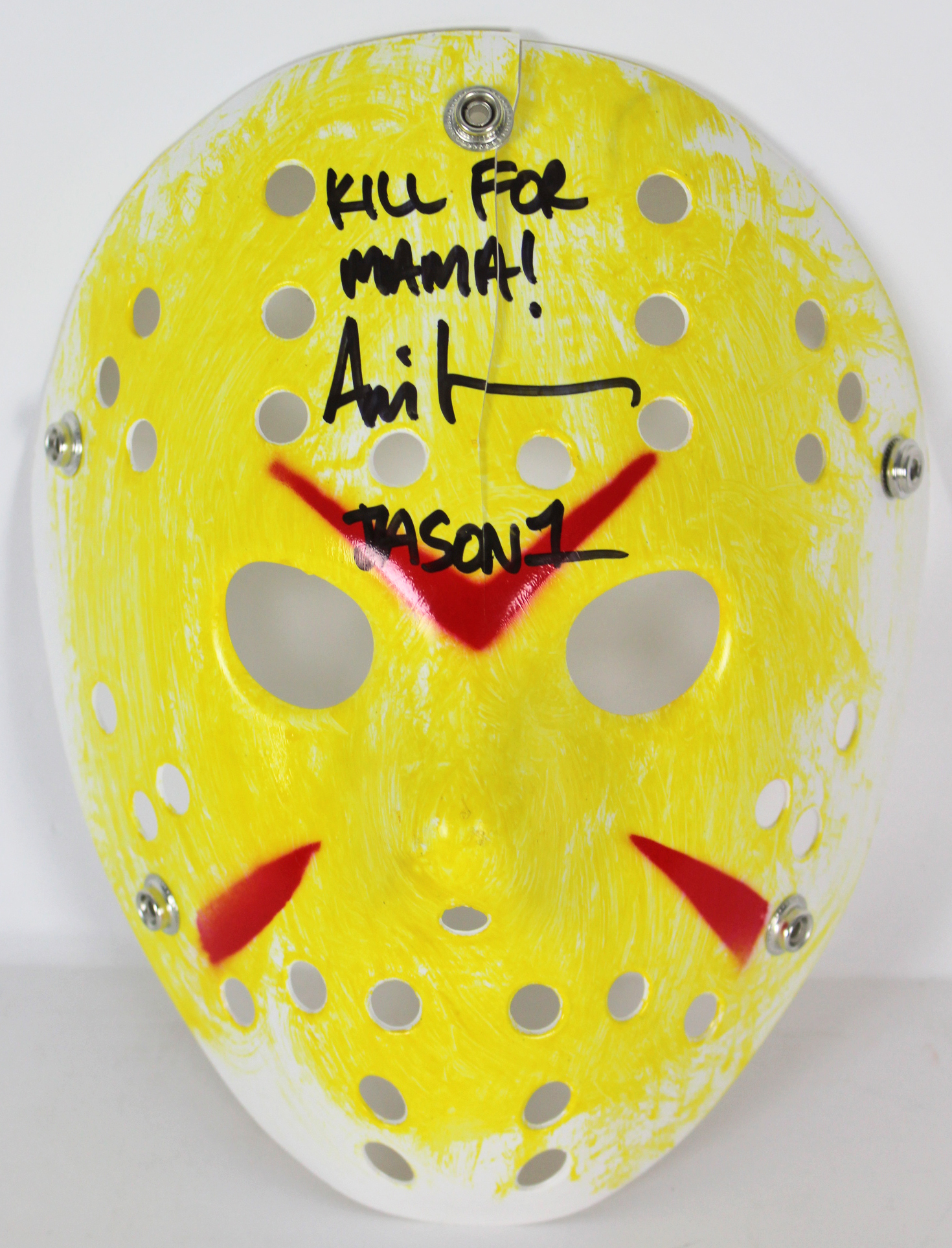 Ari Lehman Friday The 13th "Kill For Mama!" Signed Yellow Jason Mask BAS #D67491