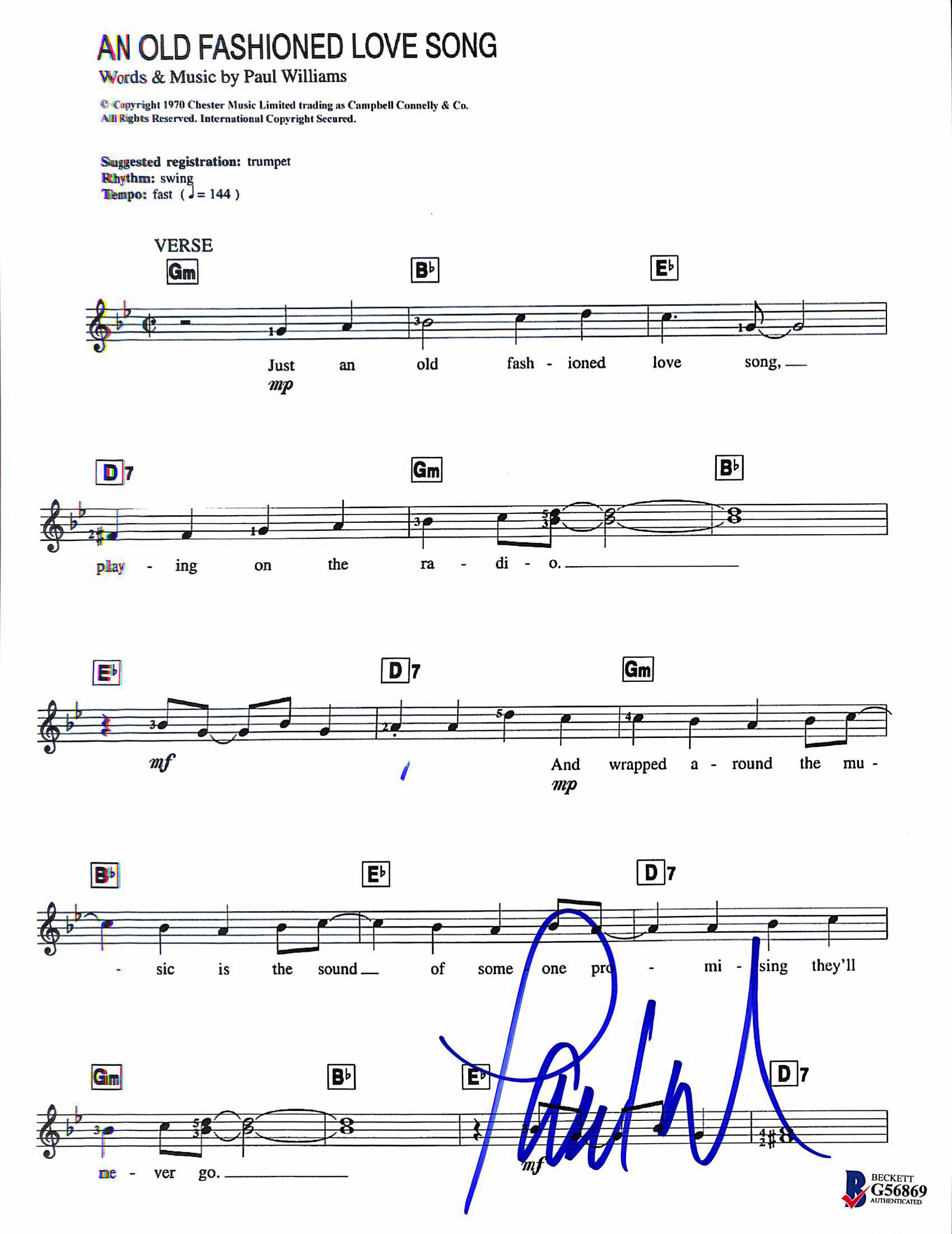 Paul Williams Signed An Old Fashioned Love Song Music Sheet Photo BAS #G56869