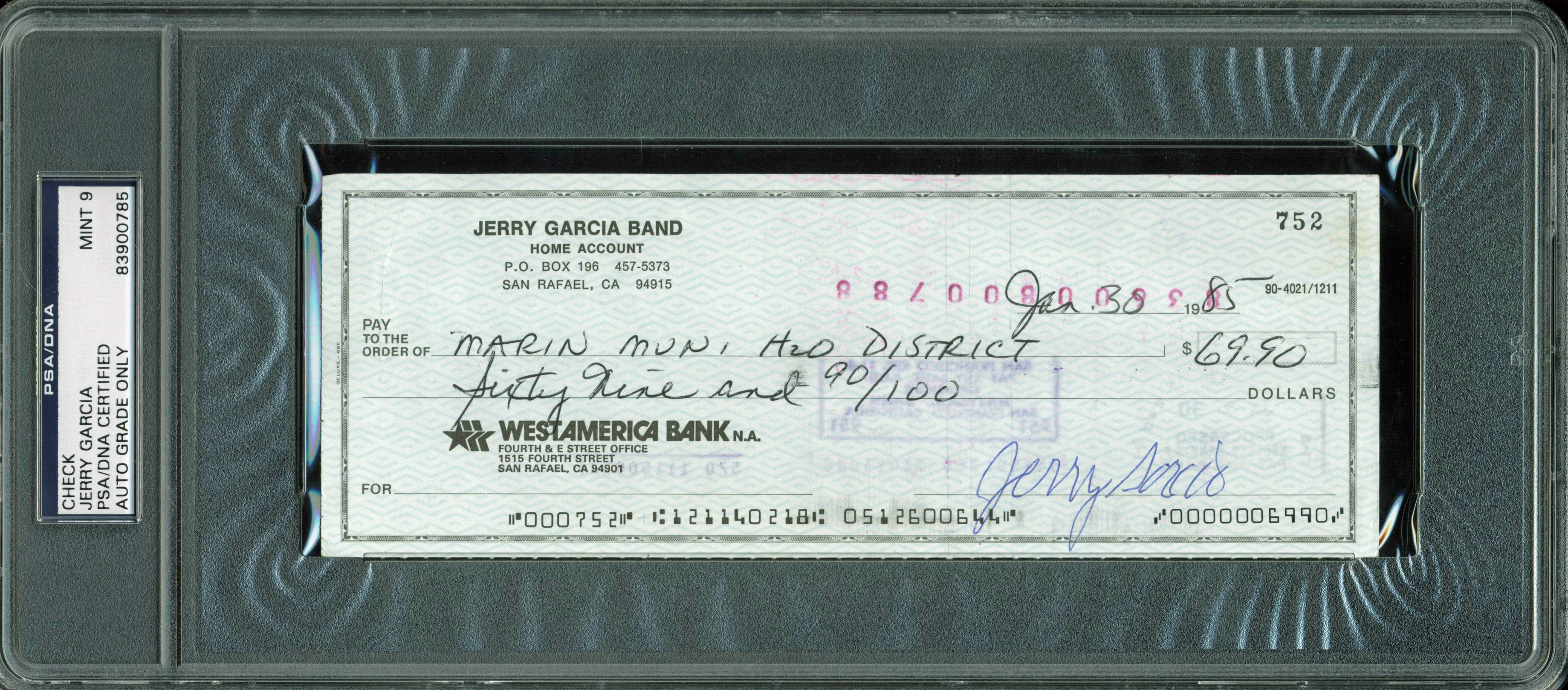 Jerry Garcia Grateful Dead Signed 1985 check Auto Graded Mint 9! PSA Slabbed