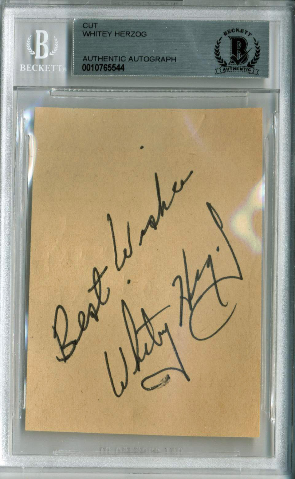 Yankees Whitey Herzog "Best Wishes" Signed 2.5x3.5 Cut Signature BAS Slabbed