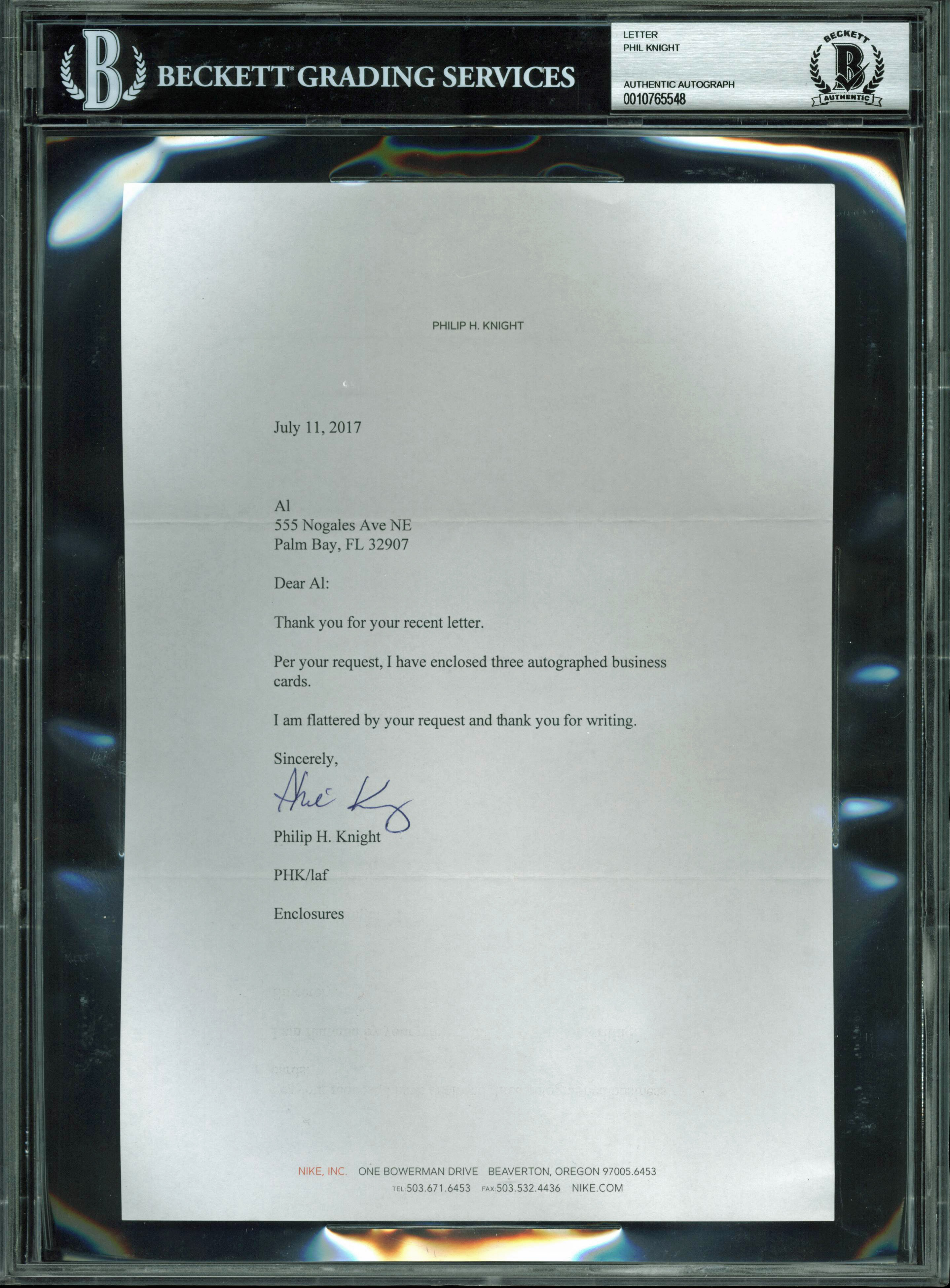 Phil Knight Authentic Signed Nike CEO July 2017 Letter Autographed BAS Slabbed