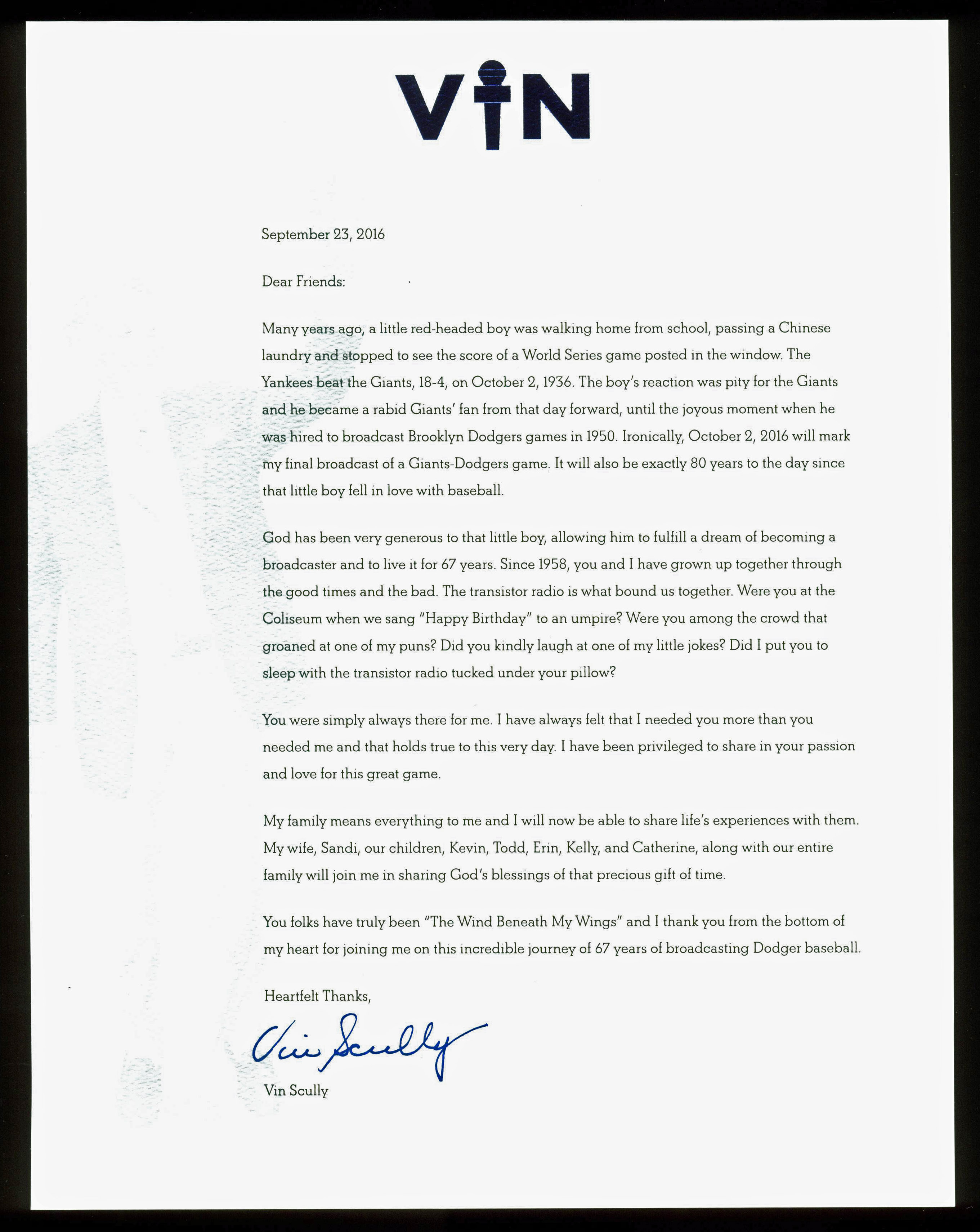 LA Dodgers Vin Scully 2016 Retirement 8.5x11 Letter Unsigned