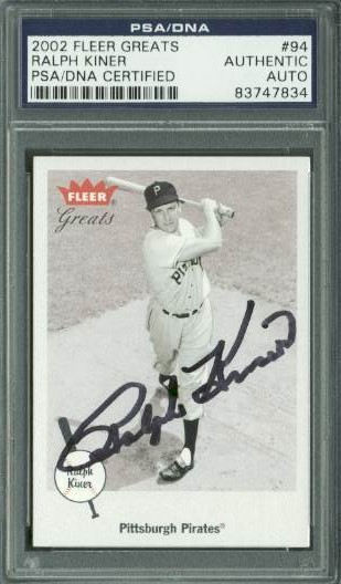 Pirates Ralph Kiner Authentic Signed Card 2002 Fleer Greats #94 PSA/DNA Slabbed