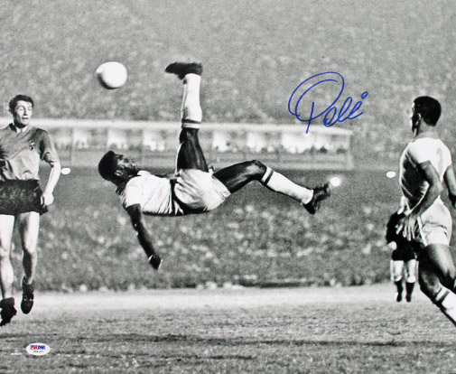Pele Brazil Soccer Signed Authentic 16X20 Bicycle Kick Photo in Blue PSA/DNA