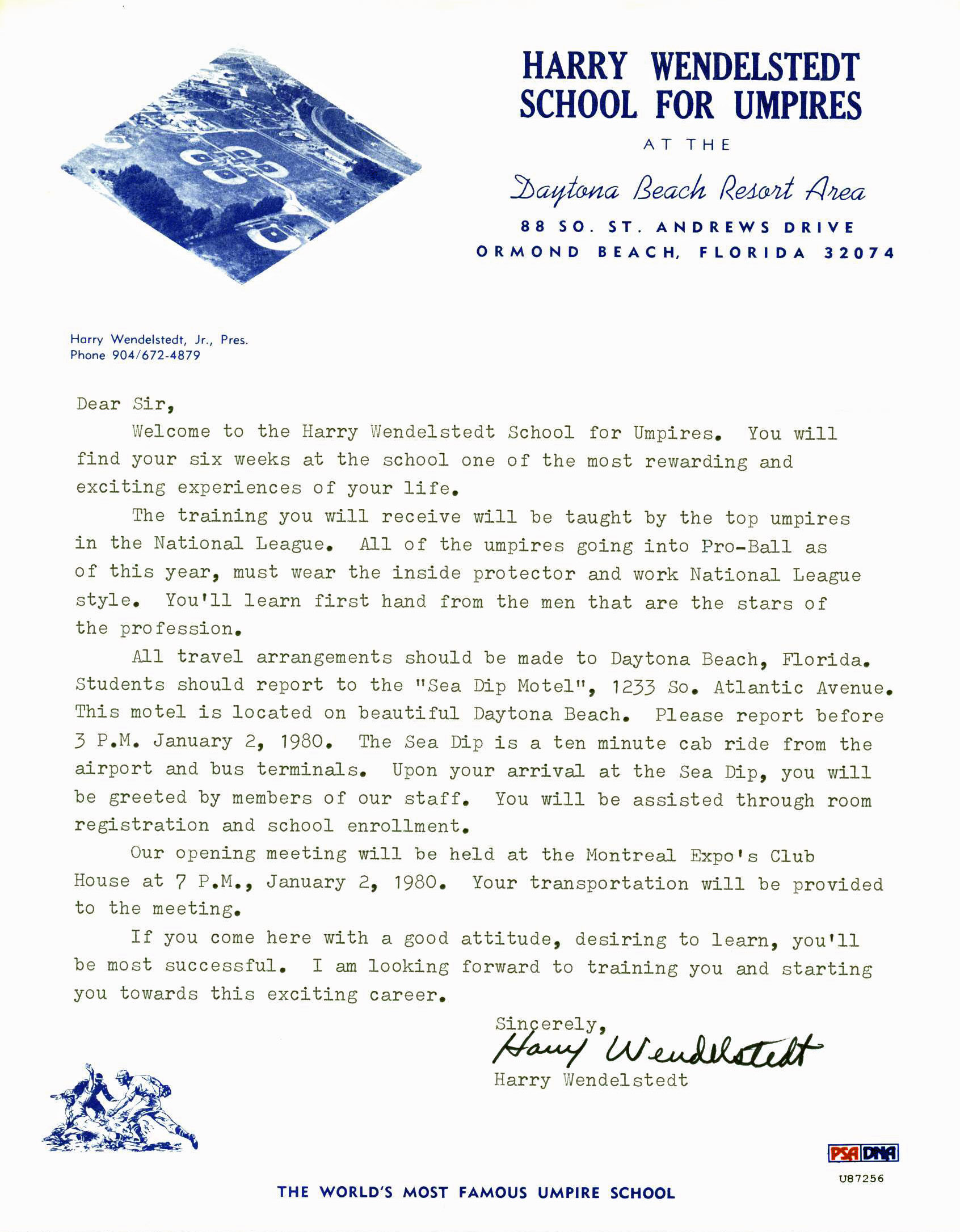 Harry Wendelstedt Signed 8.5x11 Letter On School Letterhead PSA/DNA #U87256