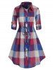 Plus Size Plaid Drawstring Curved Roll Tab Sleeve Shirt Dress