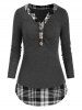 Houndstooth Plaid Panel Half Button Ruched T Shirt