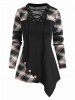Plaid Print Lace up Mock Button Asymmetrical T shirt